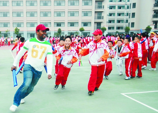 昨日,上虞市华维文澜小学举办联谊趣味活动,设立了“幸福向前冲”等趣味游戏项目。这是学生们在与外教做游戏。
