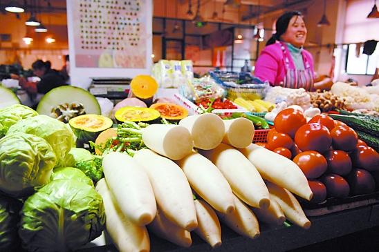 11月15日,农贸市场的摊贩以每斤2元的价格出售萝卜。