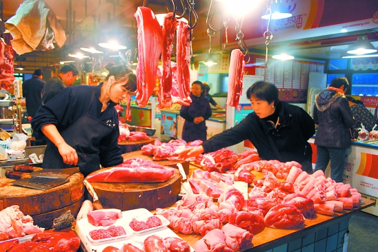 顾客在农贸市场选购猪肉。 颜伟杰 摄