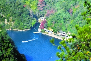 由紫藤长廊拾阶登上坝顶,眼前展现的是一湖静水,绿水荡漾,深不可测。水面上疾驶的游船,不时激起层层涟漪,把两岸元宝峰等山峰的倒影弯折。泛舟湖上,水鸟在水面低飞,狭长的湖面见不到尽头,大有“青山绿水景无尽”之感,又有“一折青山一扇屏,一弯绿水一古琴”的诗意。