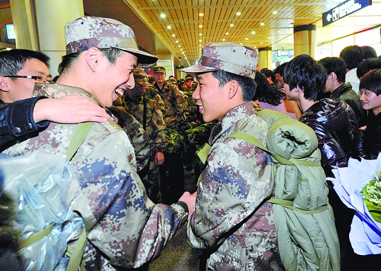 上图:杭州清波街道的新兵陈侃(左)与孙国虎(右)在车站相识,他们同赴西藏守边关。