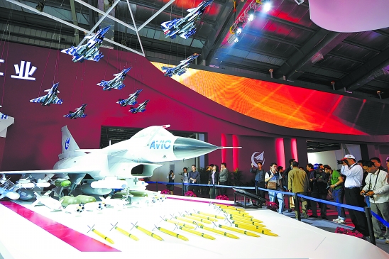 11月19日,观众在参观歼10战机模型。当日,第八届中国国际航空航天博览会迎来首个公众开放日,航展从当日起将连续3天向公众开放。
