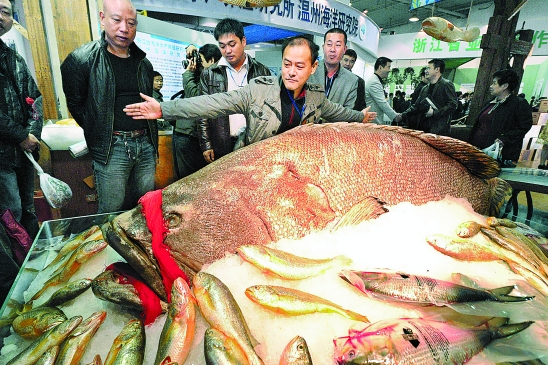 昨天,中国(温州)特色农博会在温州国际会展中心开幕,展出了上万种农产品。图为温州黄渔国水产食品有限公司展位上,展出了一条渔民捕获的超级石斑鱼,重达380斤。本报记者 吴元峰 通讯员 庄颖昶 摄