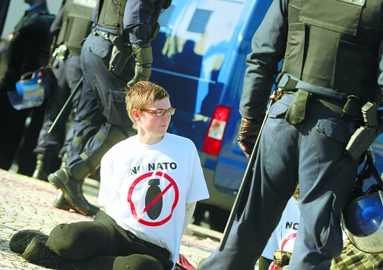 11月20日,在葡萄牙首都里斯本的北约峰会会场附近,一名试图封堵道路的抗议者被警方逮捕。新华社发