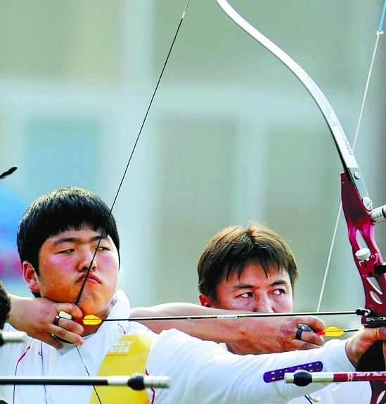 11月20日,第16届亚运会射箭男子个人预赛在广东奥体射箭场进行。韩国选手金优镇(左)以144支箭1387环的成绩打破世界纪录。