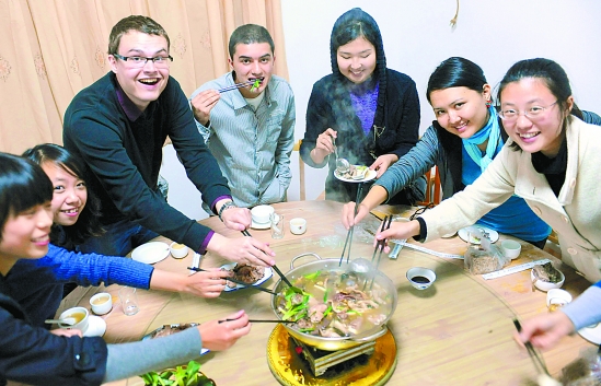 昨日,来自德国的马克(左三)等一群外国朋友来到 “中国民俗美食第一村”——杭州仓前羊锅村的华海羊锅城,体验在中国农家掏羊锅的美妙感觉。