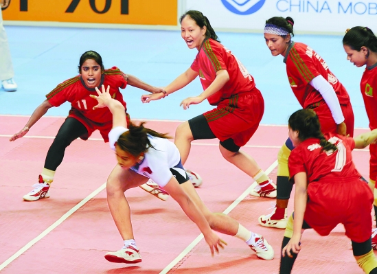 11月25日,卡巴迪半决赛在广州南沙体育馆举行,泰国女队以34比23战胜孟加拉国女队,进军决赛。另一组的半决赛印度女队以23比22险胜伊朗。泰国和印度两队今日将争冠。本报记者 潘良干摄