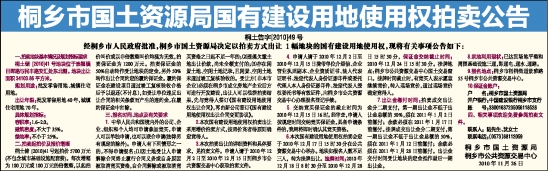 桐乡市国土资源局国有建设用地使用权拍卖公告
