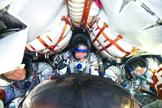11月26日,在哈萨克斯坦阿尔卡雷克市以北的草原上,俄罗斯宇航员尤尔齐欣(中)、美国宇航员维洛克(左)和沃克尔返回地面。当日,俄罗斯地面飞行控制中心宣布,国际空间站3名宇航员于当日清晨乘俄“联盟TMA-19”载人飞船安全返回地球。 新华社发