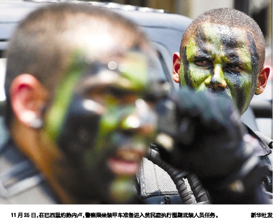 11月25日,在巴西里约热内卢,警察乘坐装甲车准备进入贫民窟执行围剿武装人员任务。新华社发