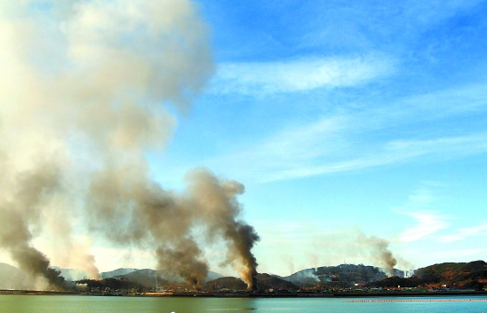 11月23日,韩国西部延坪岛上硝烟滚滚。新华社发