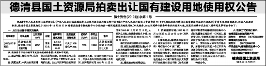 根据《中华人民共和国土地管理法》、《中华人民共和国城镇国有土地使用权出让和转让暂行条例》和中华人民共和国国土资源部第39号令《招标拍卖挂牌出让国有建设用地使用权规定》等有关法律法规规定,经县人民政府批准,德清县国土资源局定于2010年12月21日14时整在德清县招投标中心公开拍卖一幅国有建设用地使用权(本次拍卖,如达不到举行拍卖所要求的竞买人数,则采用挂牌方式出让),现将有关事项公告如下: