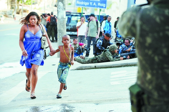 11月27日,在巴西里约热内卢北部的阿勒穆山脚,居民快步跑过交火区。 当日,里约警方向据守在阿勒穆山的匪徒及其附近同伙发出最后通牒,限令当日之内投降。 新华社记者 宋为伟 摄