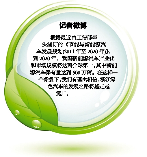 根据最近由工信部牵头制订的《节能与新能源汽车发展规划(2011年至2020年)》,到2020年,我国新能源汽车产业化和市场规模将达到全球第一,其中新能源汽车保有量达到500万辆。在这样一 个背景下,我们有理由相信,浙江绿