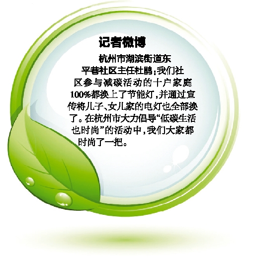 杭州市湖滨街道东平巷社区主任杜鹃:我们社区参与减碳活动的十户家庭100%都换上了节能灯,并通过宣传将儿子、女儿家的电灯也全部换了。在杭州市大力倡导“低碳生活也时尚”的活动中,我们大家都时尚了一把。
