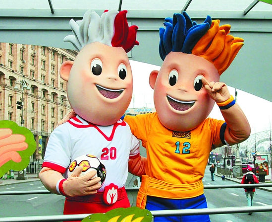 11月28日,2012年欧洲足球锦标赛的双胞胎吉祥物在乌克兰首都基辅街头向人们致意。2012年欧锦赛将由波兰和乌克兰联合举办。新华社发