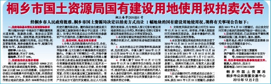桐乡市国土资源局国有建设用地使用权拍卖公告