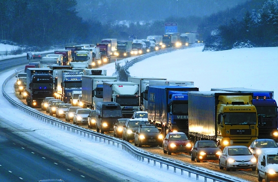 12月1日,在英国南部肯特郡一条积雪的公路上,交通发生拥堵。 新华社发