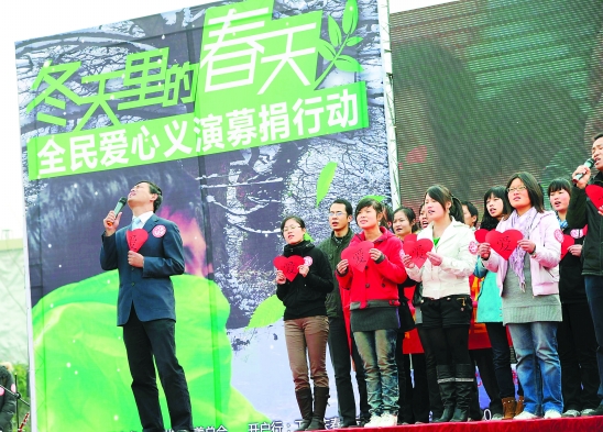 为给身患重病的儿子筹钱治病,年近五旬的母亲董观荣在杭州街头学唱《春天里》,让无数网友和读者为之动容。12月11日下午,一场名为《冬天里的春天》的全民爱心募捐义演在杭州举行,再次唱响《春天里》,掀起现场捐款热潮。本报记者 董旭明 摄