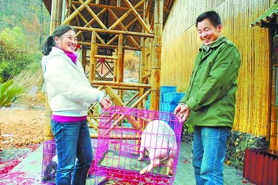 邹锦丰、钱小飞夫妻双双抬“金乌”猪回家。叶宁 摄