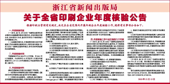 (六)各市、县(市、区)文化广电新闻出版局在2011年4月15日前,将本辖区内年度核验工作总结和通过年度核验印刷企业及暂缓年度核验、不予年度核验企业名单报浙江省新闻出版局印刷复制管理处。