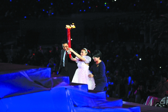 聋哑女孩珍珍(中)在传递火炬。新华社发