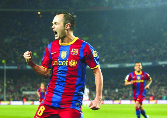12月12日,在2010-2011赛季西甲联赛第15轮比赛中,巴塞罗那队主场以5比0战胜皇家社会队,以领先皇马2分的优势领跑西甲。图为巴塞罗那队球员伊涅斯塔庆祝进球。新华社发