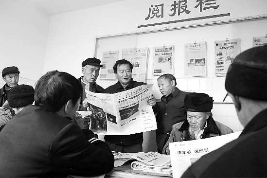 昨天下午,在常山县招贤镇敬老院活动室的阅报栏前,老人们围在一起阅读当天的报纸。今年以来,该镇29个行政村和敬老院都建立阅报栏,指定专人管理,每天更换报纸。