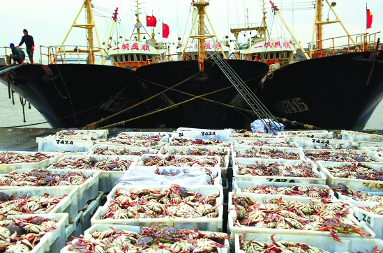 12月14日,温岭市松门镇龙门码头摆满了刚从海上运回的鱼蟹。受强冷空气影响,渔船纷纷进港,带回大量的鱼货,温岭市鱼货交易市场鱼货数量比平时增加三分之二。周学军 潘国志 摄