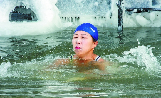 12月14日,一名冬泳爱好者在哈尔滨市松花江中游泳。 新华社发
