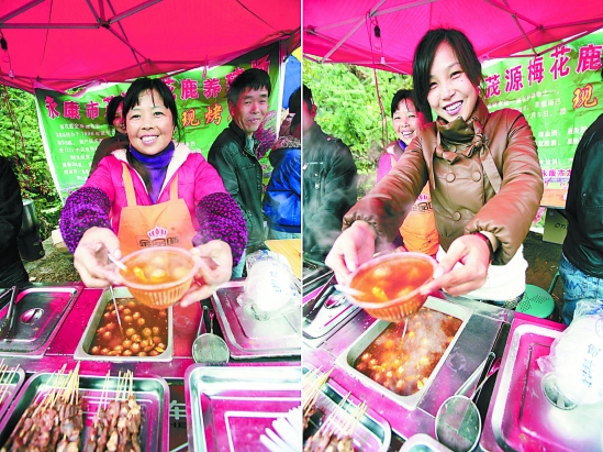 | 胡丽女(左),是永康市茂源梅花鹿开发有限公司负责人、国家鹿业协会会员。近日,她与女儿黄昭君(右)推出“喝鹿汤、防冻疮,看黄(王)昭君”活动,吸引了八方来客。图为母女俩正热情地向客人送鹿汤、鹿丸等鹿类美食。本报记者 邵全海 摄 |