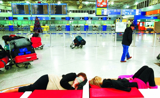 | 从13日开始,希腊的公交系统、医疗卫生系统员工进行连续5天的罢工行动,连续几天的公交停运导致雅典市中心交通拥堵,市民出行非常不便。希腊公职协会以及私营企业协会已宣布15日举行全国性大罢工,这将是今年第9次全国性大罢工。图为12月15日,几名乘客滞留在希腊雅典国际机场。 新华社发 |