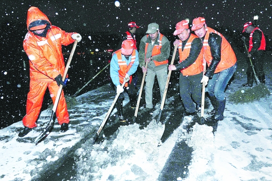 杭州环卫工人连夜清扫断桥积雪。记者 吴元峰 摄
