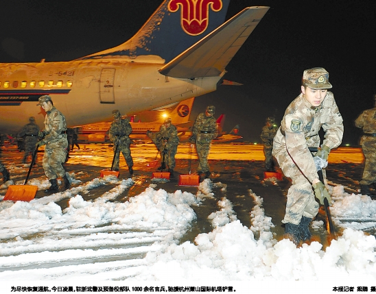 为尽快恢复通航,今日凌晨,驻浙武警及预备役部队1000余名官兵,驰援杭州萧山国际机场铲雪。 本报记者 梁臻 摄