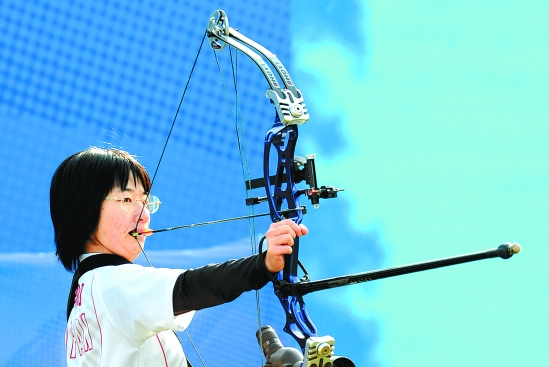 12月16日,在广州2010亚残运会女子个人复合弓公开级决赛中,日本选手永野美穗以7比1战胜韩国选手柳顺德,获得冠军。 新华社发