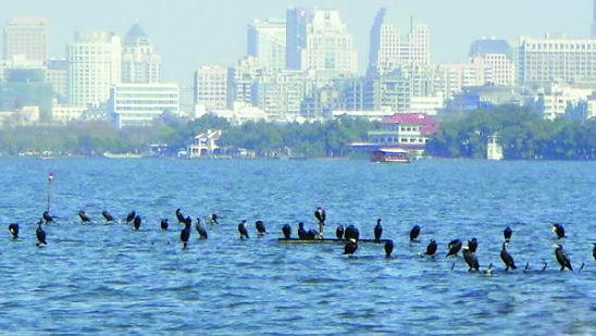 昨日,杭州西湖湖面上,大量鸬鹚栖息在喷泉的喷头上,成为冬日湖中一景。
