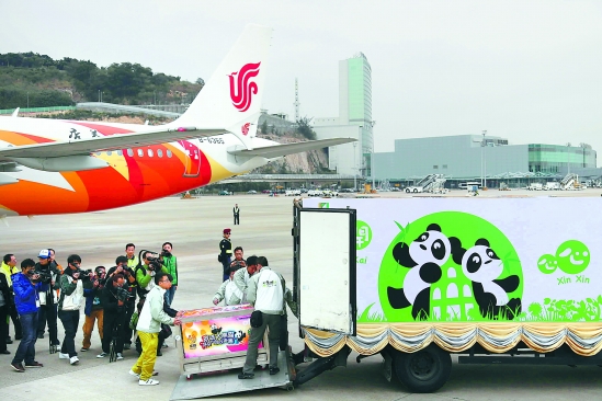 这是大熊猫“开开”被推送上澳门特区政府民政总署专设的卡车。 新华社记者 张金加 摄