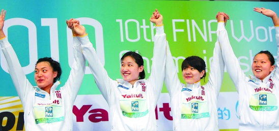 12月17日,在迪拜举行的第十届世界短池游泳锦标赛女子4X100米混合泳接力决赛中,由唐奕、刘子歌、赵瑾、赵菁(从左至右)组成的中国队以3分48秒29的成绩逆转美国队夺冠,并刷新了赛会纪录。 新华社发