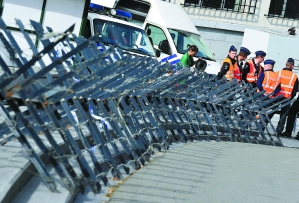 | 在比利时首都布鲁塞尔,警察站在为保障亚欧峰会而摆设的路障旁。新华社发 |