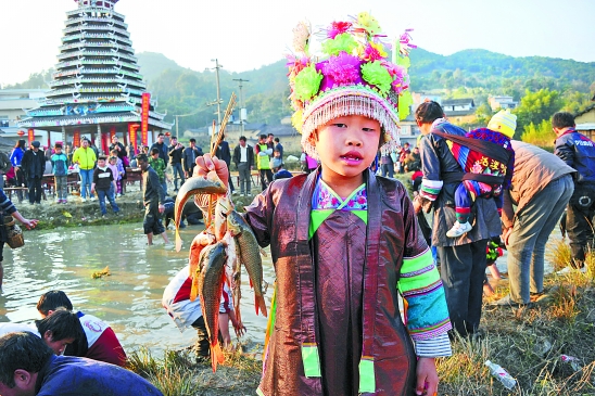 12月18日,广西河池市罗城仫佬族自治县龙岸镇大蒙村纳冷屯侗寨迎来一年一度的“鱼节”,当地村民举行开塘捕鱼比赛。图为一名侗族小女孩展示在“鱼节”上抓到的鱼。 新华社发(吴耀荣 摄)