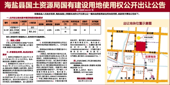 2.挂牌报名时间:2010年12月27日至2011年1月13日15时止(工作日)。地点:海盐县国土资源局土地利用科。报名时请根据挂牌文件要求递交相关报名资料及竞买保证金支付凭证。