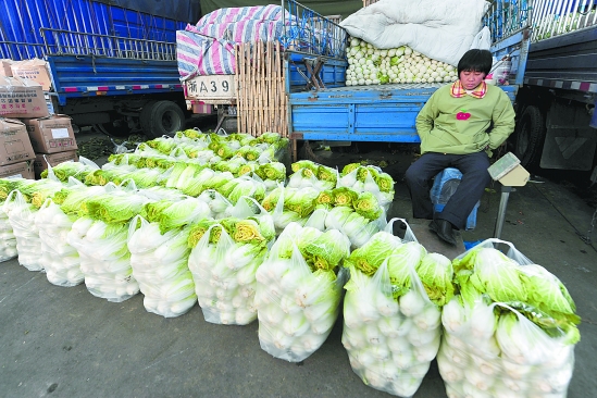 12月20日,杭州蔬菜批发交易市场,一位来自萧山的菜农守着大堆的黄芽菜进入梦乡。这些黄芽菜前不久每斤售价1.20元,而现在降到0.45元也少人问津。杭州蔬菜市场价格最近大幅回落,白菜、萝卜等常见蔬菜降幅达到50%甚至更高。