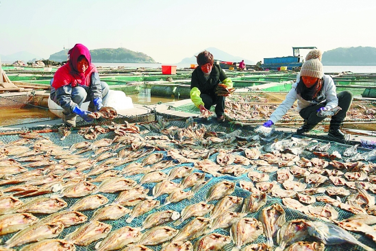 12月20日,舟山市普陀区水产养殖户正在海上晾晒日本黄姑鱼鲞。当地养殖户利用网箱养殖方法,在浅海处放养日本黄姑鱼,冬季起捕后晒成鱼鲞,销往福建、广东等地。