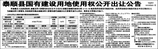 经泰顺县人民政府批准,泰顺县国土资源局决定以公开方式出让泰顺县新城区新府公寓LZ-01-06地块的国有建设用地使用权。此次国有建设用地使用权公开出让的出让人为泰顺县国土资源局,具体组织实施由泰顺县国土资源局委托泰顺县公共资源交易中心承办。现将有关事项公告如下: