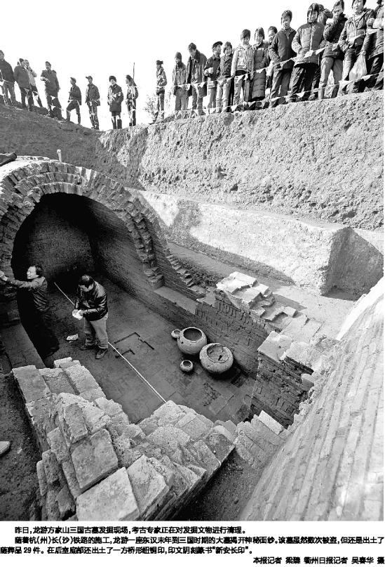 | 昨日,龙游方家山三国古墓发掘现场,考古专家正在对发掘文物进行清理。 随着杭(州)长(沙)铁路的施工,龙游一座东汉末年到三国时期的大墓揭开神秘面纱。该墓虽然数次被盗,但还是出土了随葬品29件。在后室底部还出土了一方桥形纽铜印,印文阴刻篆书“新安长印”。 本报记者 梁臻 衢州日报记者 吴春华 摄 |