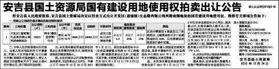 安吉县国土资源局国有建设用地使用权拍卖出让公告
