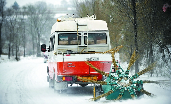 | 记者在宁夏固原市西吉县偏城乡道路上看到一辆由十把扫帚和一个小车组合成的“自动化”扫路机在雪后路面作业。这种清扫车节约人力,效率高,成为乡村养路工人的得力帮手。图为“自动化”马路清扫车在清扫积雪。 新华社记者 王鹏 摄 |