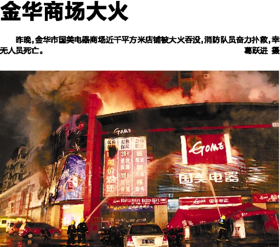 昨晚,金华市国美电器商场近千平方米店铺被大火吞没,消防队员奋力扑救,幸无人员死亡。 葛跃进 摄