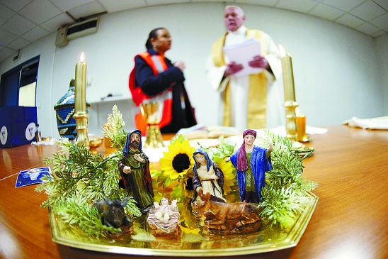 12月24日,在法国巴黎戴高乐机场,一名神父开始举行弥撒。由于遭受冰雪天气的困扰,戴高乐机场许多航班延误,滞留的乘客只能在机场享用平安夜晚餐。