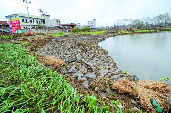 | 江西省会昌县周田镇23日起发生一起地质沉降灾害。塌陷区域直径约50米,边缘塌陷深度为30厘米左右,中间塌陷深度约5米,84户民房出现大小不等裂缝,村民457人已连夜转移,未发生人员伤亡。专家认为,这起地质灾害因盐矿采空诱发地质沉降引起。图为周田镇新圩村一块农田塌陷成水塘。新华社记者 周科 摄 |